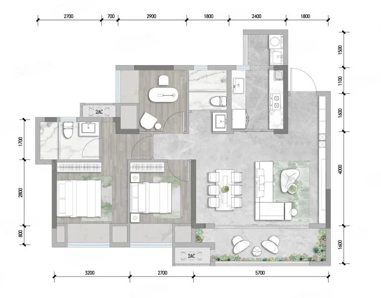 2 室 2 厅 1 卫